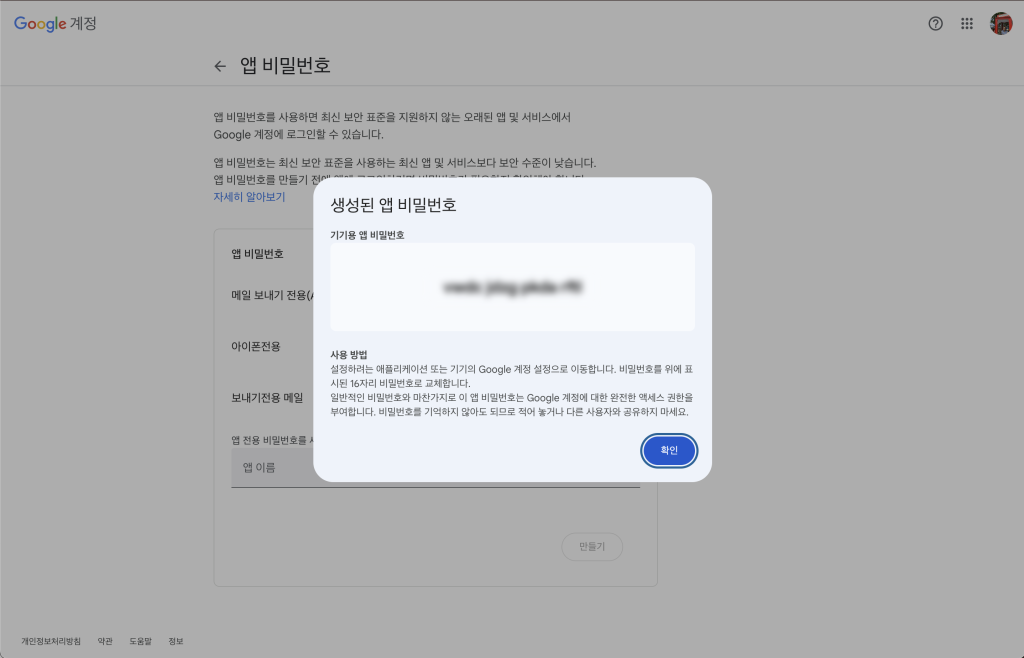 - 상단 검색창에서 “앱 비밀번호” 입력